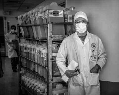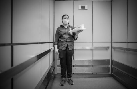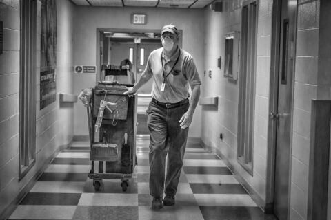 Once immersed in the work, I soon reached a peaceful zone — what artists have long thought of as “no mind.” It’s a creative space where we don’t think about rules of composition or what color goes with another or how the results may be regarded. I was just being there with my cameras and perceptions. After I was introduced to the medical team, I also noticed the staffers who were cleaning and maintaining the unit and bringing food to patients. I made sure to include those unsung contributors in my photographs.
