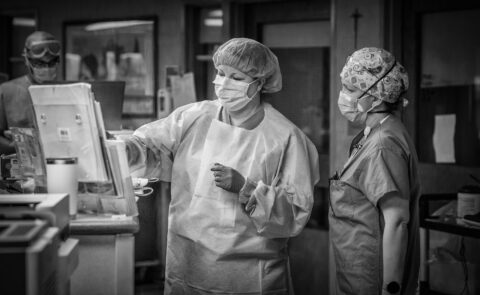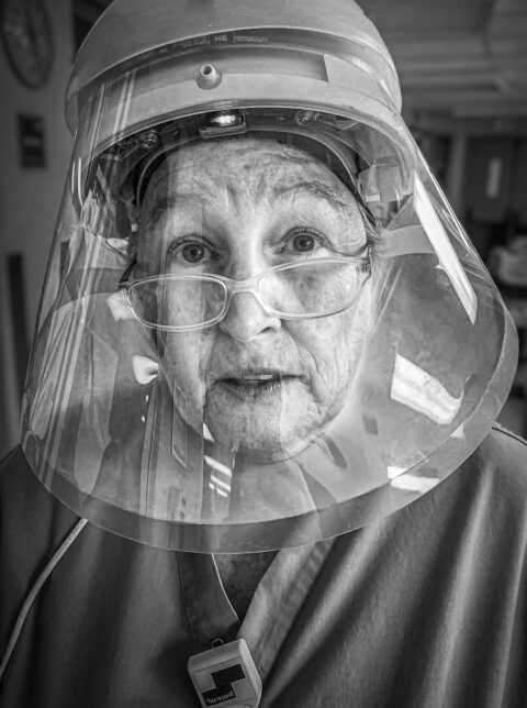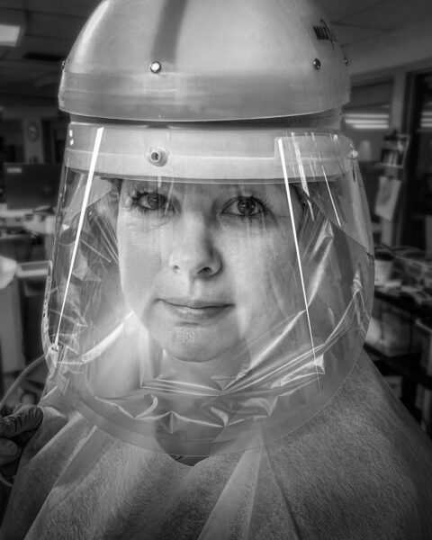 On April 11, Deborah called again – only now, she was determined to capture images within the ICU itself and inform her public about the tireless efforts of her medical teams. Having attended one of my street photography presentations in Newburyport in 2018, Deborah now had the notion of shooting the ICU photos not as portraits but in the gritty style of my street photos – people in motion, the unflinching truth, black and white images. I admit that I agonized for 24 hours before deciding to accept the assignment. Ultimately, I knew that I couldn’t live with myself if I didn’t take those pictures. My son Chris agreed that I should proceed. And I had persuaded myself, shakily, that it was more dangerous to enter a supermarket than a Covid ICU.