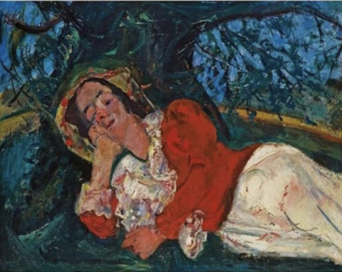 De Courbet, il choisit Les Demoiselles au bord de la Seine : une jeune femme allongée contre le tronc d’un arbre, un éventail à la main et quelques fleurs des champs, se repose accoudée, la joue dans la main. A nouveau, avec les Castaing, il cherche et trouve le modèle adéquat en la personne de l’épouse d’un garde-barrière qu’il convainc de poser pour lui. C’est La Siesta, la pose est directement inspirée du tableau de Courbet quoique la manière de peindre ne lui doive pas grand-chose. On raconte que le mari jaloux est venu, furieux, rechercher sa femme. Encore une fois il a fallu parlementer, Soutine menace de le poursuivre pour atteinte aux Beaux-Arts qui sont la valeur suprême et n’ont rien à céder aux bonnes mœurs.