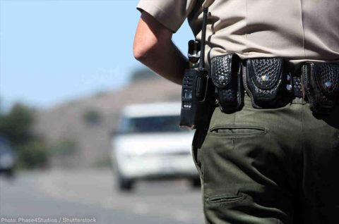 In a surprisingly calm voice, he says, “If you could hand me your license, registration, and proof of insurance, please.”