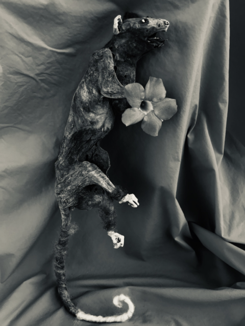 Given the rigid posture of “my” possum, I decide to stand it upright against a draped backdrop, balanced on its prehensile tail. I’ve picked a Brazilian jasmine, a flower lacking symbolic resonance, the throat of which, although shallow and pale, seems to absorb light.