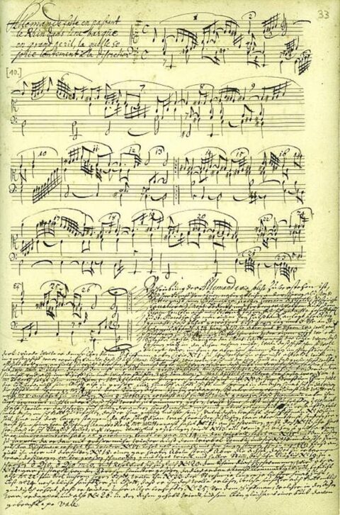 [left — Allemande faite en passant le Rhin dans une barque en grand péril] During this period, Froberger copied out and composed the pieces titled with autobiographical references that have done most to sustain his fame: Allemande, faite en passant le Rhin dans une barque en grand peril, Lamentation faite sur la mort très douloureuse de Sa Majesté Impériale, Ferdinand le troisième, An. 1657,Lamentation sur ce que j’ay été volé et se joüe à la discretion et encore mieux que les soldats m’ont traité, Lamento sopra la dolorosa perdita della Real Maestà di Ferdinando IV Rè de Romani, Plainte faite à Londres pour passer la melancholie, Tombeau fait à Paris sur la mort de Monsieur Blancrocher, and most famously of all, Méditation sur ma mort future (Mediation on My Future Death). These pieces involved meditative contemplations on the inevitability of loss, impermanence, and death; their combination of chromatic irregularities in style brisé and the temporal uncertainty in unmeasured preludes gave them their profound sense of yearning and search.