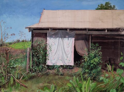 from “The Washhouse” series, oil on paper on wood, 12″ x 16″ (2020)