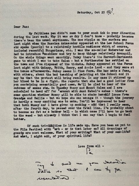 “Pa and I never physically touched each other throughout the years,” she recalls, “not by hand or by cheek … There was still formality between middle class parents and children. You picked up affection by the look in a person’s eyes.” But this isn’t a complaint. The child learned to return the look. She notes the “200 letters he wrote to me in my teens … Their attitude triggered my expectations of a better world.” The expectations were not realized, as she tells her father: