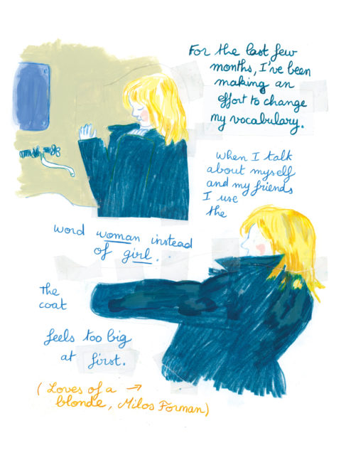 That anxiety sends her back to childhood, where she considers the constraints of girlhood, returning to memories of molestation by an older cousin. Delporte’s palette throughout the book comprises mostly primary colors, emphasizing washes of blue, and the rigid cursive is clear. Yet the images still convey a sense of uncertainty, incompleteness that sometimes shades into a quiet fury. A page of smears of paint is captioned “I feel like I’m carrying the weight of an old family story”; in a classroom, noting that in French grammar masculine take precedence, she draws a blue blackboard reading “The grammar I was taught still hurts.”
