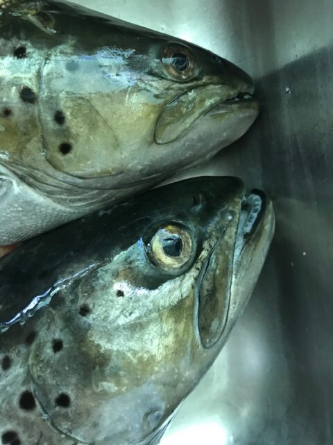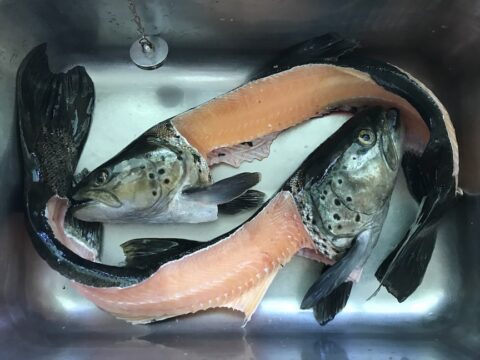 I understand that where I see exquisite patterns, colours, textures, shapes, and the shiny silver surface of the old kitchen sink rhyming with the shiny silver scales of the fish, others might see only agony in the glassy eyes and open mouths, or be repelled by the all-but-imperceptible dab of blood on a cheek; however, when I arrange the “frames,” as they are called, and focus the camera, the act is one of honouring these animals, which nourish me nutritionally and also aesthetically. Not simply food (for their remains will be turned into stock and the meat picked from their bones), in the afternoon light they become numinous.